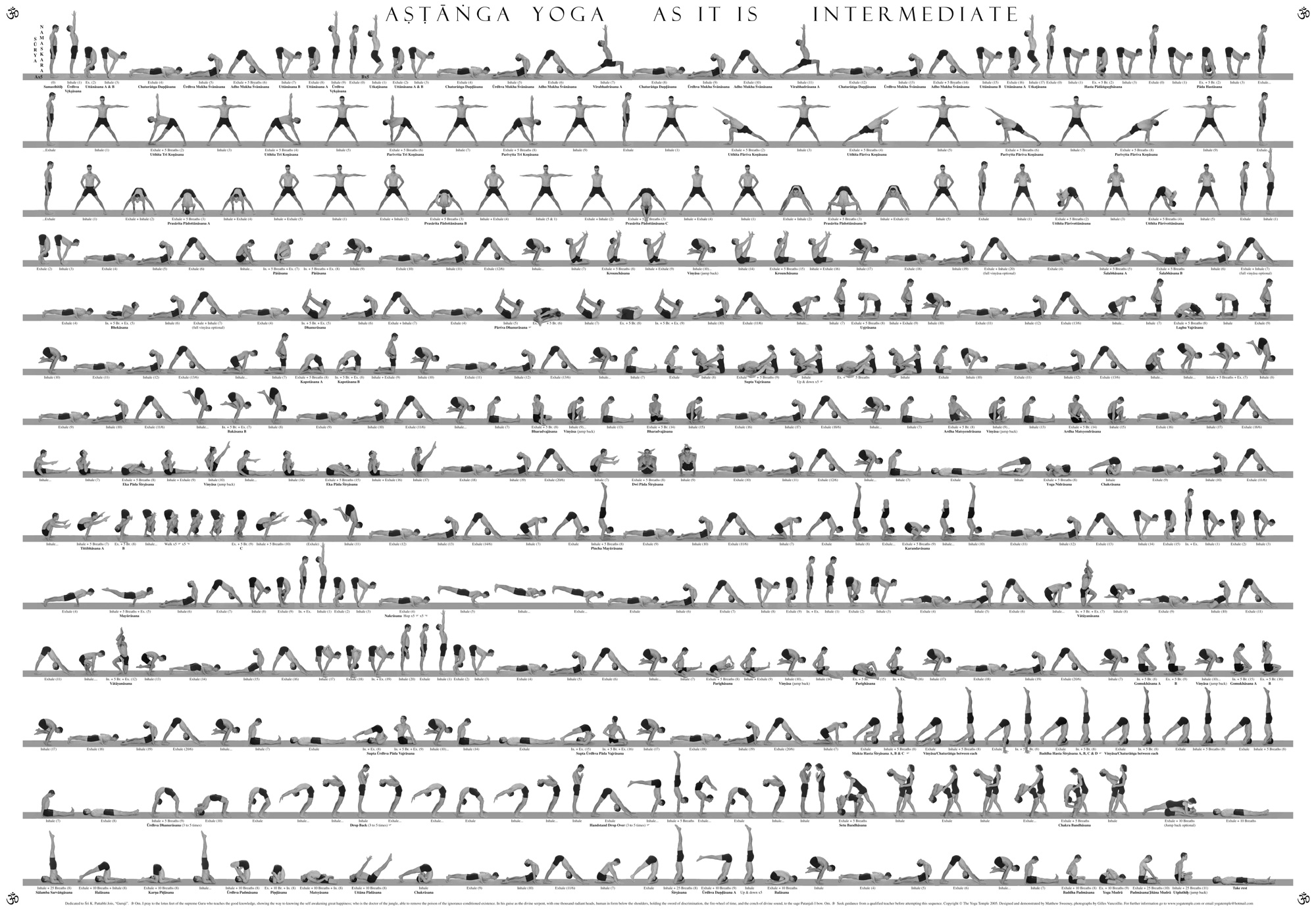 - 인터미디어트 시리즈에 처음 들어가는 수련생은 일반적인 지침은 프라이머리 시리즈의 흐름을 충분히 숙지하고 있어야 한다는 것이다. 그래서 이 시리즈를 수련하는 동안 다음 순서의 아사나를 기억해 내기 위해 책이나 정보를 참고할 필요가 없어야 한다. 그리고 다연히 전체 프라이머리 시리즈를 처음부터 끝까지 중단 없이 이어 나갈 수 있어야 한다. 아사나의 깊이보다는 중요한 것은 자신의 수준에 맞게 아사나에 다가가는 방법을 아는 것이다. 이는 자신의 직관을 따르라는 뜻이다. 호흡 안에서 온전히 깨어 있는 상태를 유지하자, 자신이 요가를 하는 목적을 계속 인식하자. 만약 그러한 영역 안에 계속 머무를 수 있다면, 어떤 시리즈를 수련하든 통찰과 내적인 람으로 가득 차게 될 것이다. 한 번의 붓질이 쌓여 그림이 완성되듯이, 수련은 한 번에 한 호흡만큼 성장한다. 수련을 하면서 하나하나의 호흡 안에서 기끔을 발견하자. 그리고 자신의 모습이 펼쳐지는 것을 지켜보면서 즐거움을 느끼자.