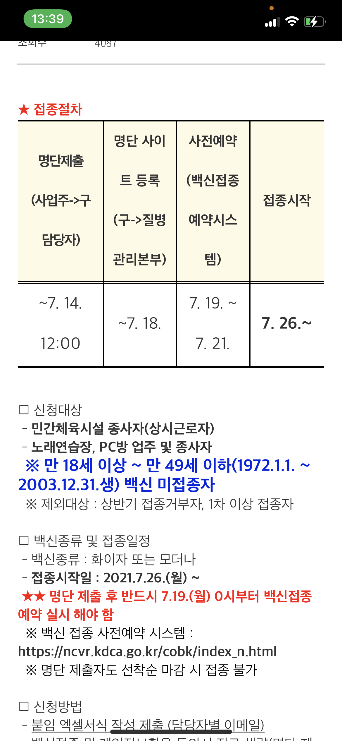 체육시설과 더불어, 노래연습장, pc방 업주 사장님들 사전 예약을 받았습니다. 백신은 선택을 하지 못한다고 하네요. 그래도 신청을 해서 기다려봅니다.