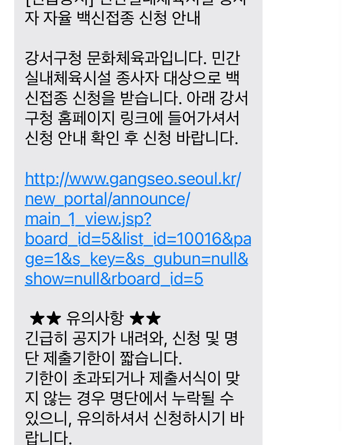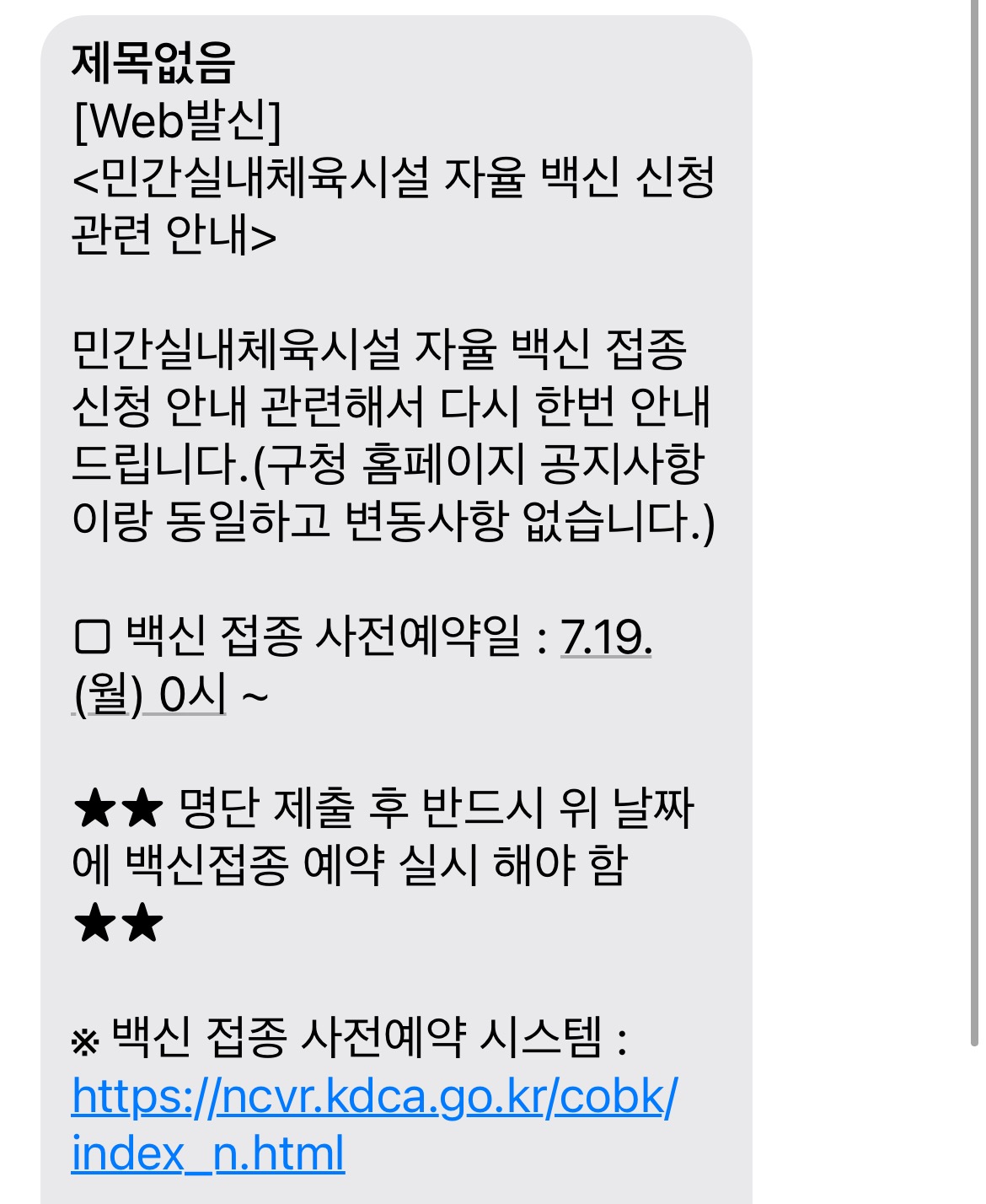 일주일동안 잔여 백신 광클만 하다가, 월요일날 원장님 통해서 문자를 받게 되었습니다. 구청에서 민간체육시설 종사자들 대상으로 사전 백신 예약이 가능하다는 문자였습다. 저는 백신을 빨리 맞고 싶어서 황급히 신청했어요.