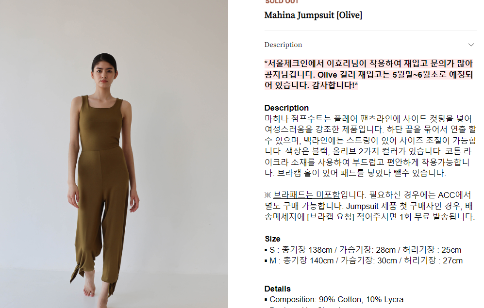 현재에도 홈페이지에 들어가지, 품절이라고 나왔네요. 5월말~6월에 입고가 된다고 하니, 필요하신 분들은 체크해 두었다가, 구매하셔도 좋을 것 같습니다. 가격은 89,000원입니다. 발리 직수입 제품으로 가격이 약간 있는데, 재질이 좋아서 정말 오래 입을 수 있는 요가브랜드입니다. 아래의 링크를 누르면, 바로 가기가 가능합니다.