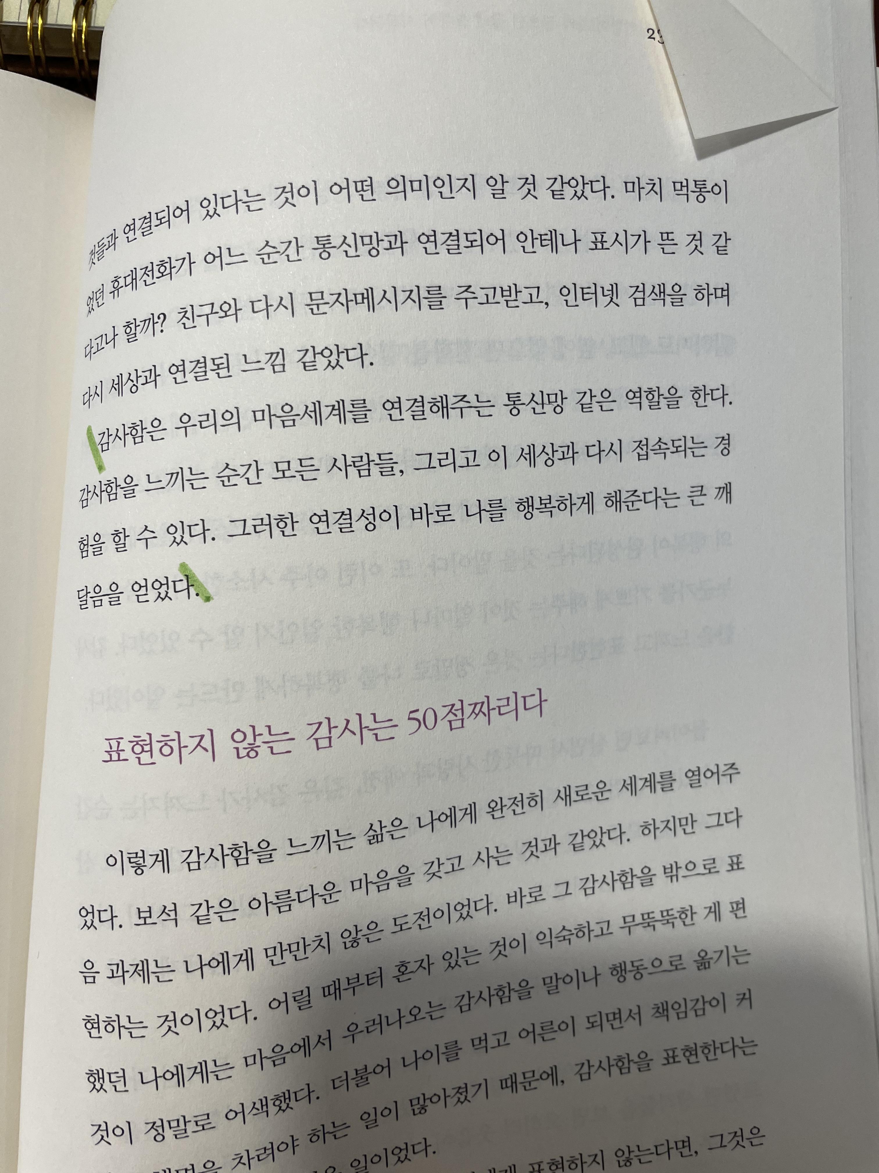 감사함은 우리의 마음세계를 연결해주는 통신망 같은 역할을 한다. 감사함을 느끼는 순간 모든 사람들, 그리고 이 세상과 다시 접속되는 경험을 할 수 있다. 그러한 연결성이 바로 나를 행복하게 해준다는 큰 깨달음을 얻었다.