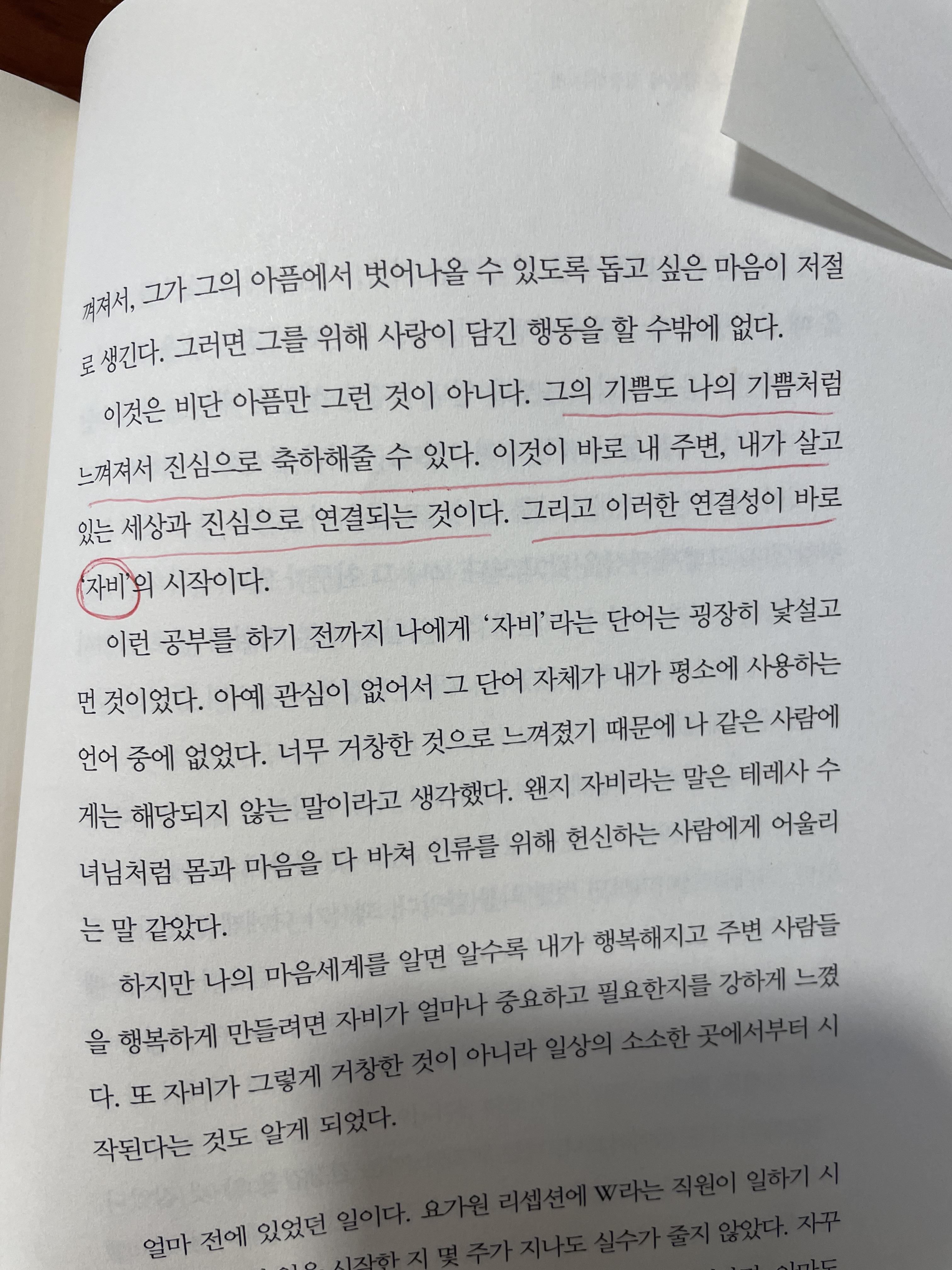 그의 기쁨도 나의 기쁨처럼 느껴져셔 진심으로 축하해줄 수 있다. 이것이 바로 내 주변, 내가 살고 있는 세상과 진심으로 연결되는 것이다. 그리고 이러한 연결성이 바로 "자비"의 시작이다.