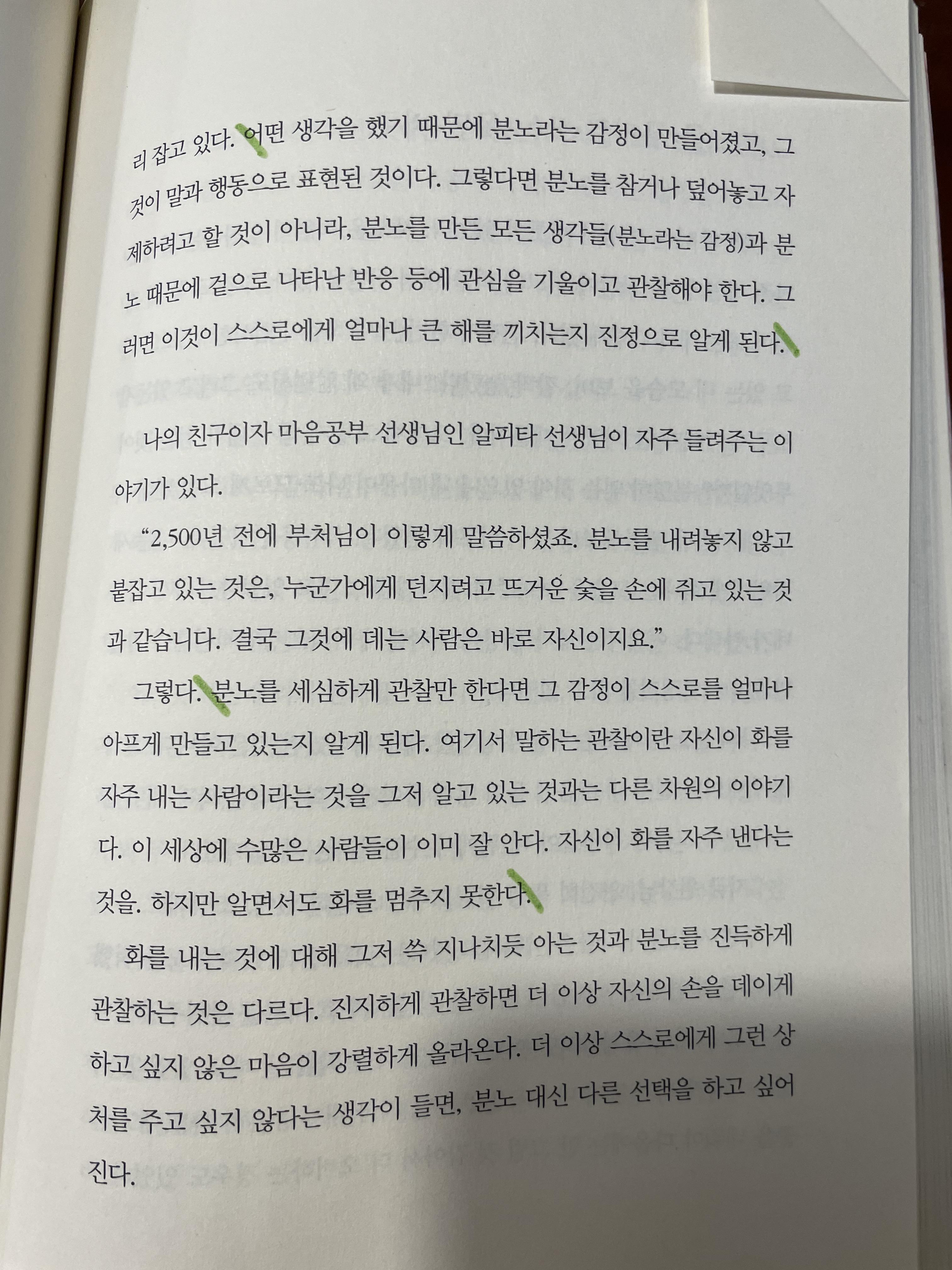 분노를 세심하게 관찰만 한다면 그 가정이 스스로를 얼마나 아프게 만들고 있는지 알게 된다. 여기서 말하는 관찰이란 자신이 화를 자주 내는 사람이라는 것을 그저 알고 있는 것과는 다른 차원의 이야기다. 이 세상에 수 많은 사람들이 이미 잘 한다. 자신이 화를 자주 낸다는 것을 하지만 알면서도 화를 멈추지 못한다.