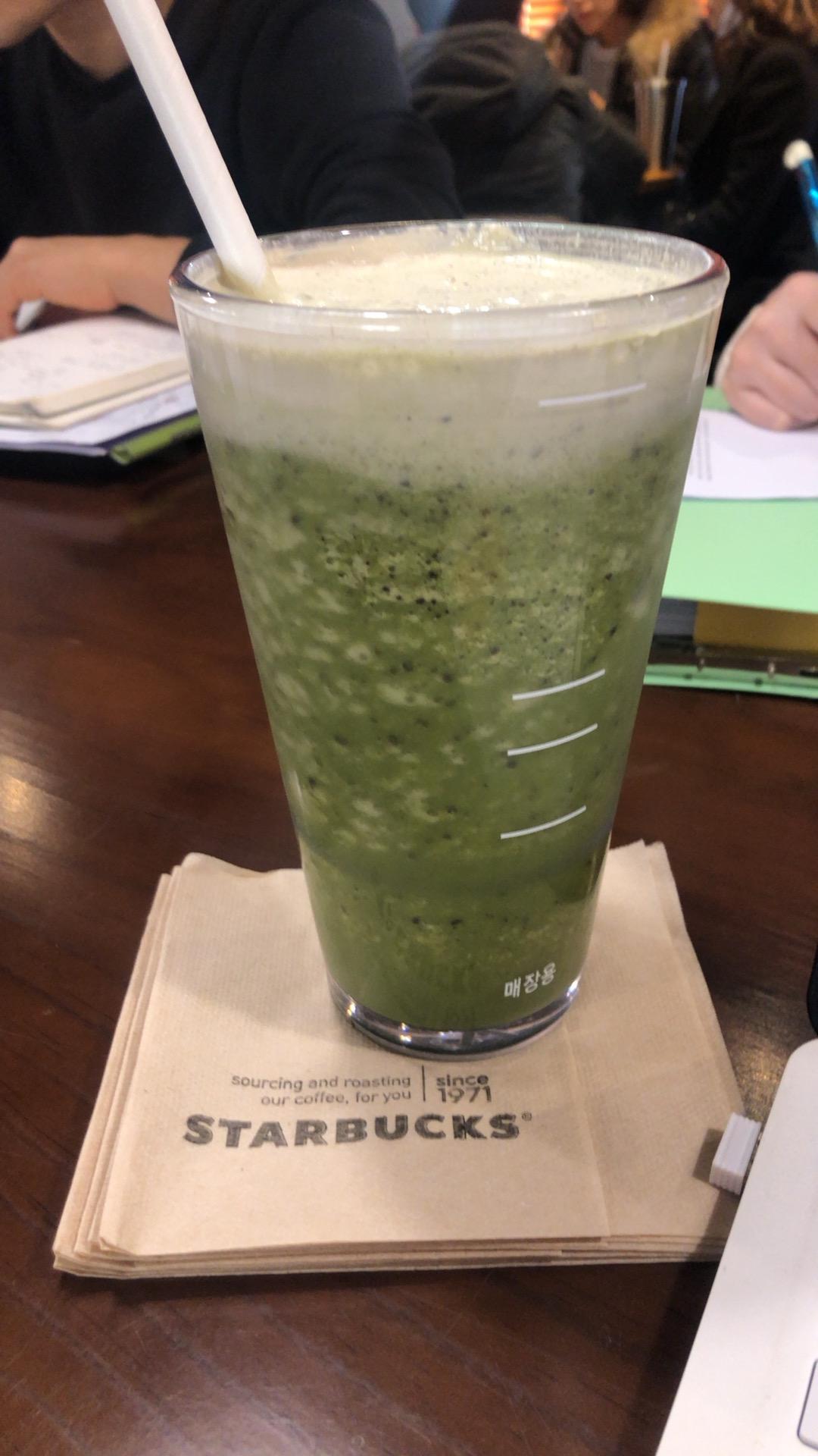 KT 멤버십을 포함해서 1,600원 실제로 결제한 금액은 1,100원 입니다. 생일을 스타벅스도 함께 추카해주는 것 같습니다. 꿀같은 주말에 그린티프라프치노와 함께 할 수 있네요. 오늘은 주말이라 사람이 많아서 주문을 해도 조금 시간이 걸렸습니다. 그리고 대마왕 그린티 프라프치노가 나왔습니다.