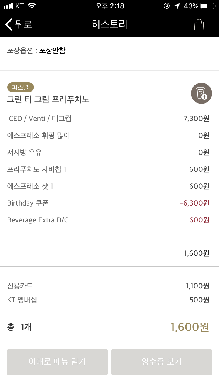 그렇게 그린티프라프치노 벤티사이즈를 주문하고, KT 1주일에 1번 사이즈업(-500원)을 신청해서 총 1,100원 결제하였습니다. 정말 저렴하죠? 그란데나 톨사이즈하면 거의0원에도 결제가 가능하지만, 오늘은 스타벅스에 오래 있을 것이라서 저는 벤티로 주문을 하였습니다.